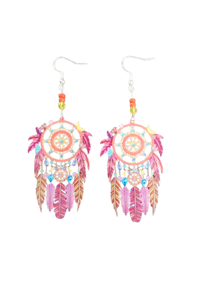 Earrings - Dream catcher with evil eye and beads and silver feather on hook