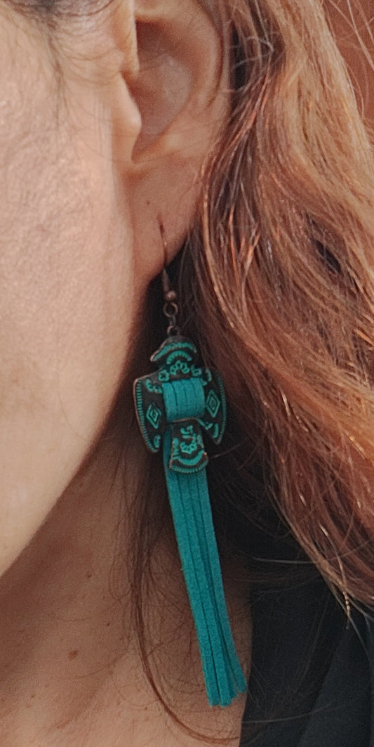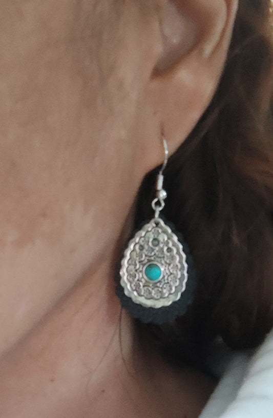 Earrings - Silver & Black leather tear drop with blue bead on silver hook
