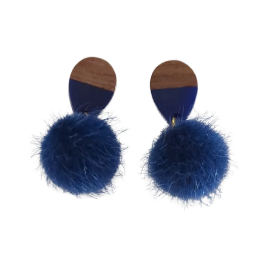 Earrings - Half Resin Walnut Wood Post Stud Earrings Geometric Natural Wooden Teardrop with pompom charm