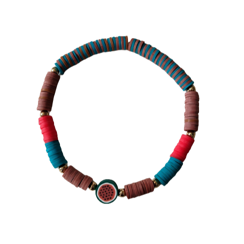 Bracelet - Large 8 inches elastic red & brown clay beads and watermelon clay bead and gold spacer beads