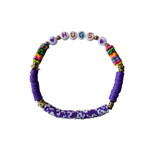 Bracelet - Large 8 inches elastic "Hugs" with purple and colorful flower clay beads and gold spacer beads