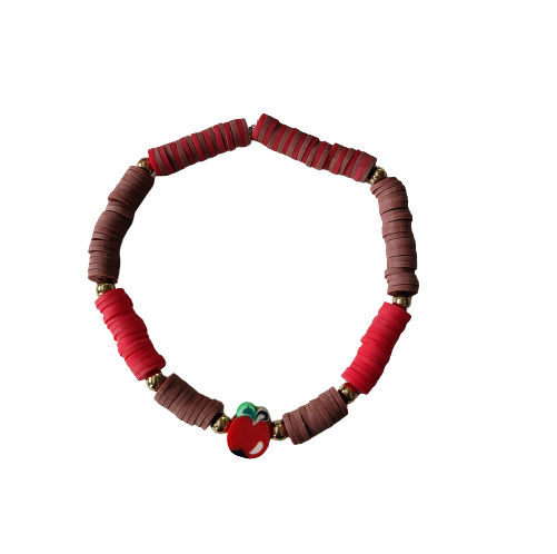 Bracelet - Medium 7.5 inches elastic red & brown clay beads and an apple clay bead and gold spacer beads