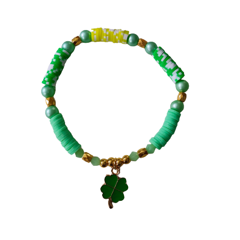 Bracelet - Medium 7.5 inches elastic green & yellow clay beads and gold spacer beads and a four leaf clover charm