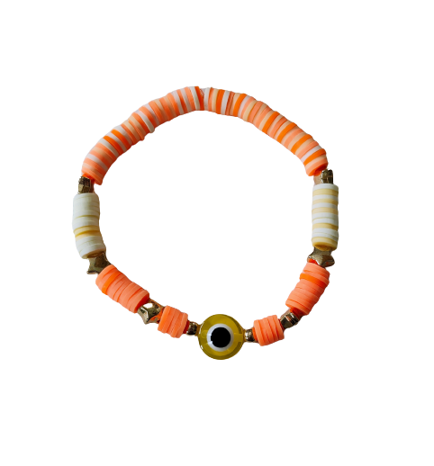Bracelet - Medium 7 inches elastic yellow evil eye with orange & yellow clay beads and gold spacer beads