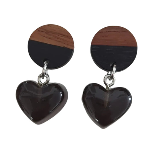 Earrings - Half Resin Walnut Wood Post Stud Earrings Geometric Natural Wooden Circle with Gummy Heart Charm