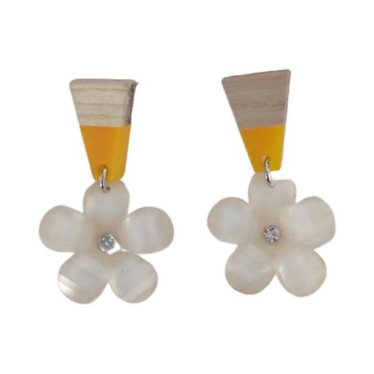Earrings - Half Resin Walnut Wood Post Stud Earrings Geometric Natural Wooden Trapezoid with flower charm