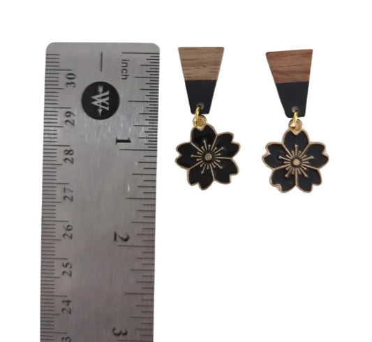 Earrings - Half Resin Walnut Wood Post Stud Earrings Geometric Natural Wooden Trapezoid with gold plated black flower