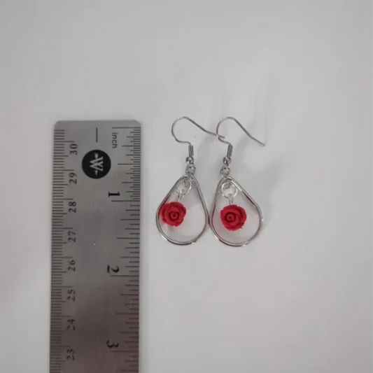 Earrings - Tear drop with Cinnabar Carved Red Rose Bead on silver hook