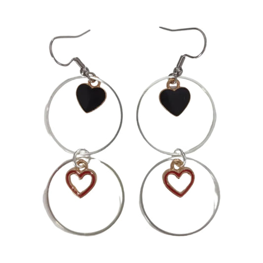 Earrings - Two 1 inch silver circles with 1 solid gold plated heart and 1 hollow gold plated heart on silver hook