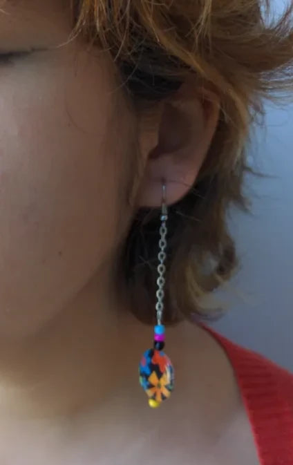 Earrings - Colorful Floral Disc Shell Beads on Silver Chain Drop Hook