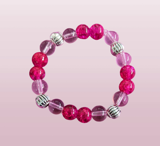 Bracelet - Large 8 inches Elastic Pink & Purple 8mm glass beads with silver acrylic spacer beads