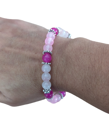 Bracelet - Large 8 inches Elastic Pink 8mm glass beads with silver metal spacer beads