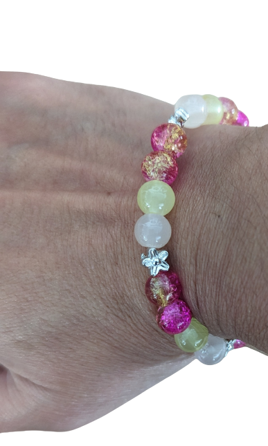 Bracelet - Medium 7.5 inches Elastic Pink & Yellow 8mm glass beads with silver acrylic spacer beads