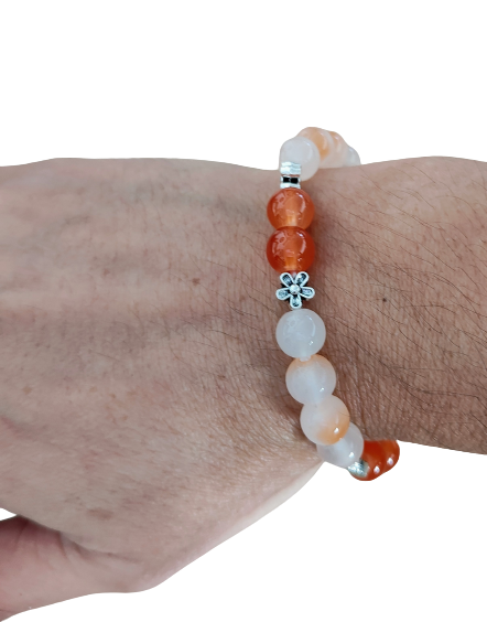Bracelet - Medium 7 inches Elastic Orange 8mm glass beads with silver spacer beads
