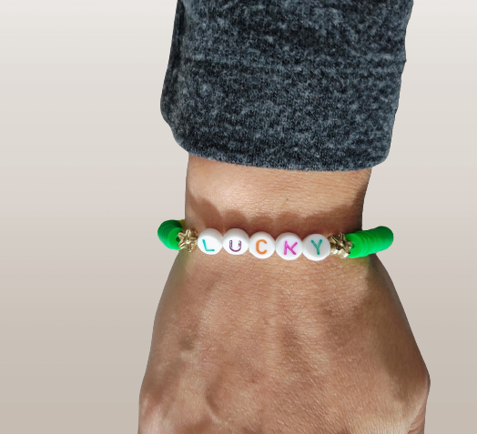 Bracelet - Medium 7.5 inches "Lucky" elastic green & yellow clay beads with gold flower spacer beads and a green happy face bead