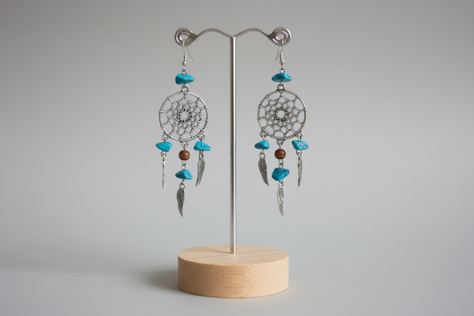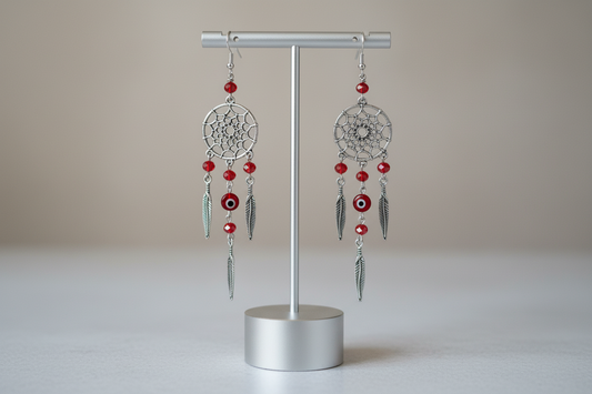 Earrings - Dream catcher with evil eye and beads and silver feather on hook