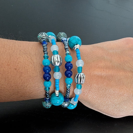 Bracelet - 4 coil Blue and silver beads on memory wire bracelet