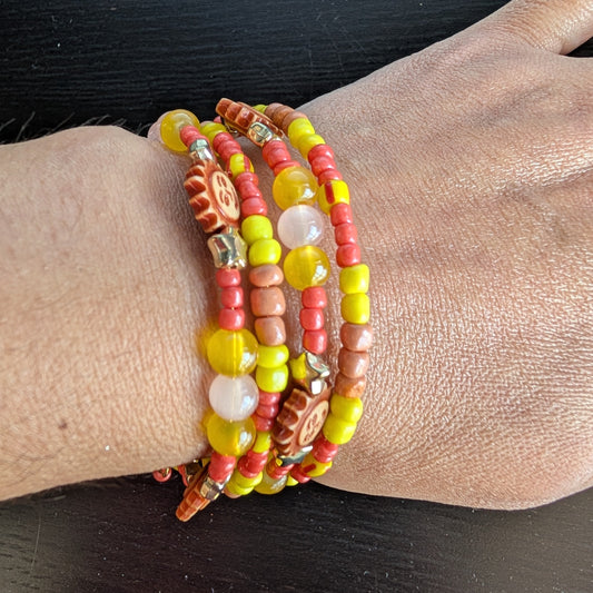Bracelet - 4 coil Yellow & Sun beads with yellow tan and orange spacer beads memory wire bracelet