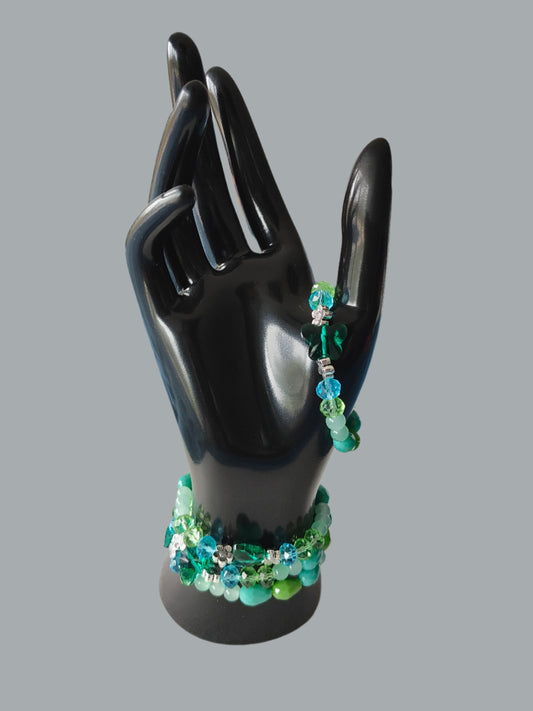 Bracelet - Elastic Crystal butterfly bead with blue and green beads and flower metal spacer beads