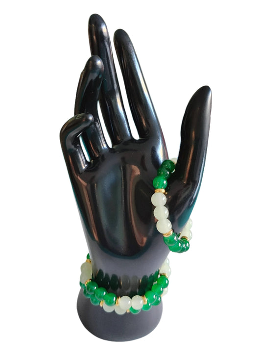 Bracelet - Elastic Green 8mm glass beads with gold spacer beads