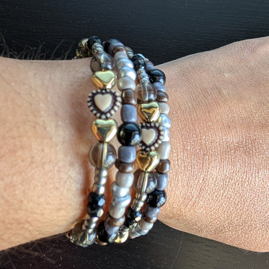 Bracelet - 4 coil Black & silver beads with gold hearts and silver spacer beads memory wire bracelet