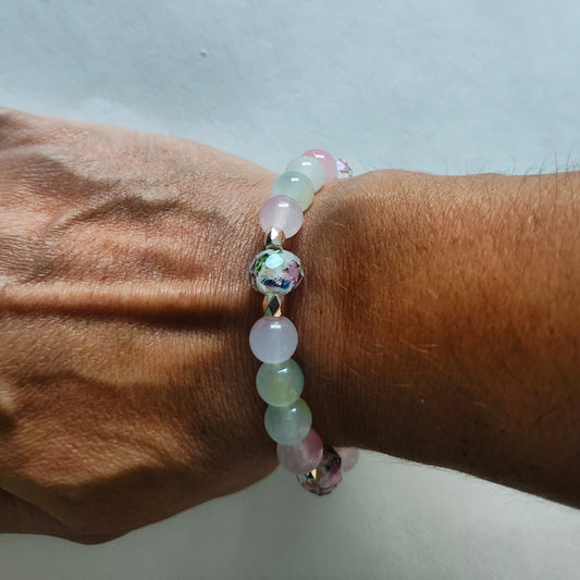 Bracelet - Elastic 9mm rose gold sand lampwork beads 8mm pink and green glass beads with gold rose spacer beads