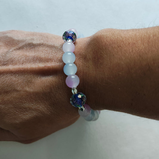 Bracelet - Elastic 9mm midnight blue rose gold sand lampwork beads 8mm blue and pink glass beads with silver spacer beads