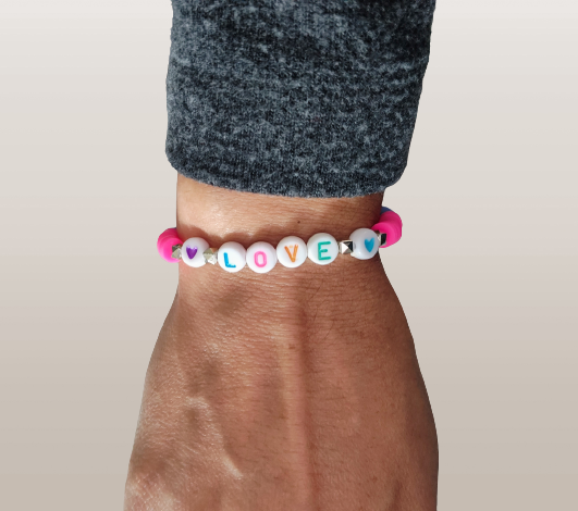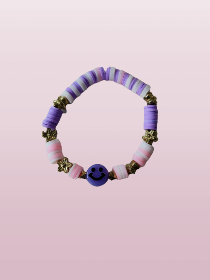 Bracelet - Elastic purple & white clay beads with acrylic hearts