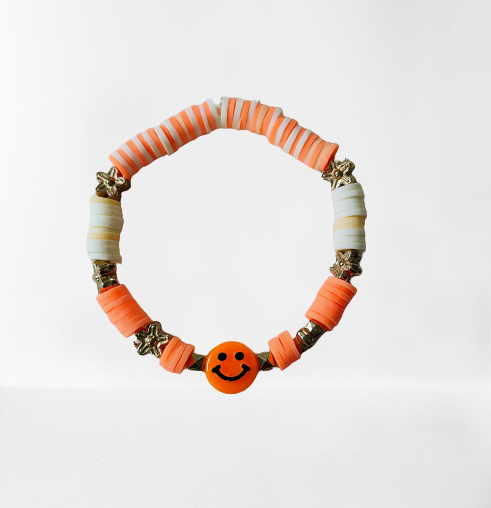 Bracelet - Elastic orange & yellow clay beads and gold spacer beads and a happy face acrylic bead