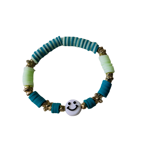 Bracelet - Elastic teal & mint clay beads and gold spacer beads and a happy face acrylic bead