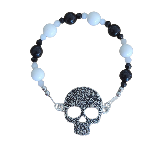 Bracelet - Elastic black & white glass beads and bicone beads with silver skeleton face charm
