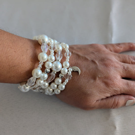 Bracelet - 4 coil & 6 coil Memory wire bracelet white pearl beads with silver spacer beads