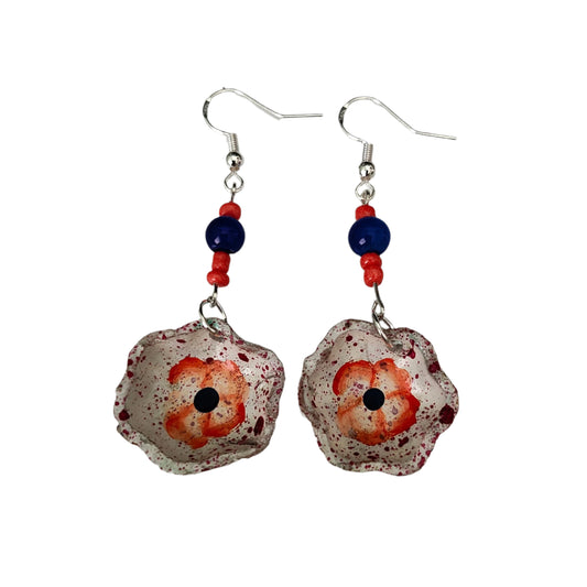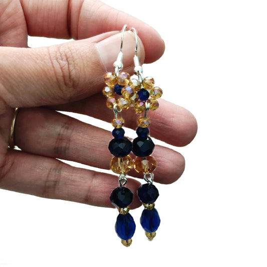 Earrings - Flower gold and navy long bead earrings on silver hook