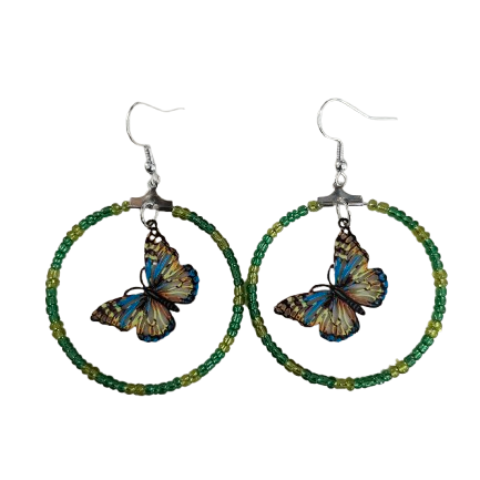Earrings - Silver hoop with seed beads and filigree butterfly on hook