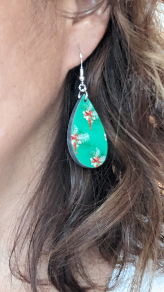 Earrings - Double sided sublimated red ornaments and green background image on silver hook