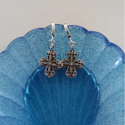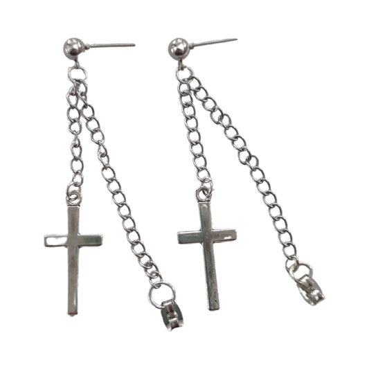 Earrings - Silver cross with silver chain on silver ball post stud earring stud