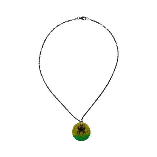 Necklace - 18 inches black chain with round yellow green resin circle ad black spider charm