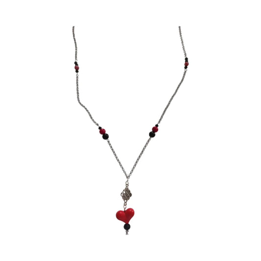Necklace - 27 inches 3 mm stainless steel rolo chain with black and red beds and charms, 5.5 inches drop extension