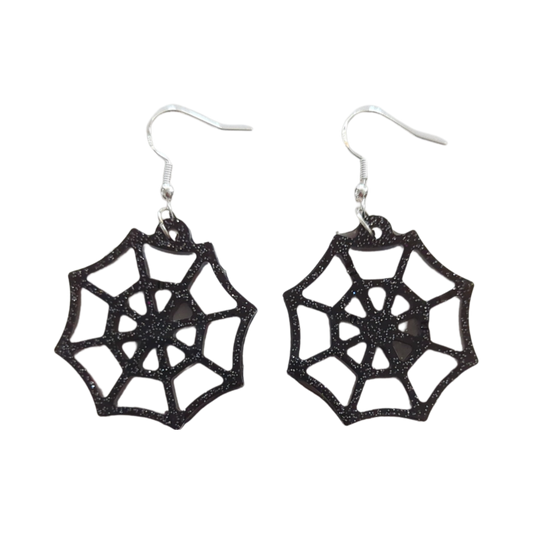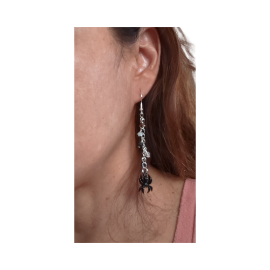 Earrings - Black spider on chain with beads and silver spiderweb on hook