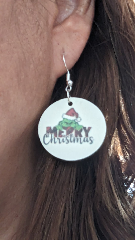 Earrings - Round double sided sublimated Merry Christmas Grinch on silver hook