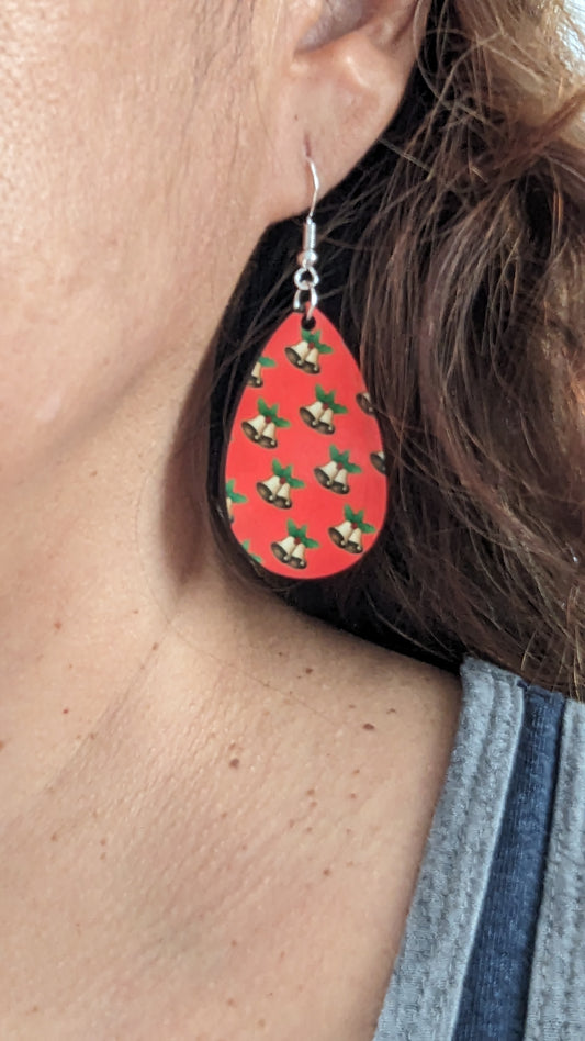 Earrings - Double sided sublimated bells with red background image on silver hook
