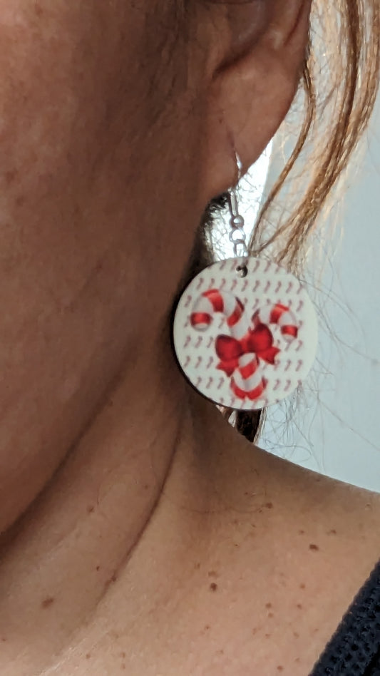 Earrings - Double sided sublimated round candy canes image on silver hook