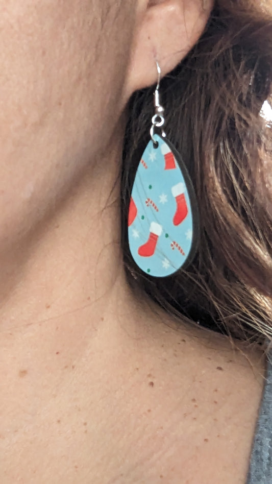 Earrings - Double sided sublimated stockings and candy canes on blue background image on silver hook