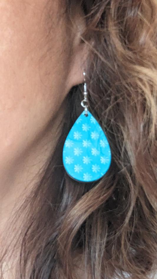 Earrings- Double sided sublimated white snowflakes on blue pattern image on silver hook