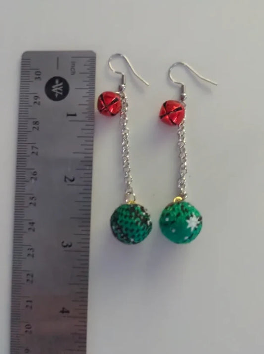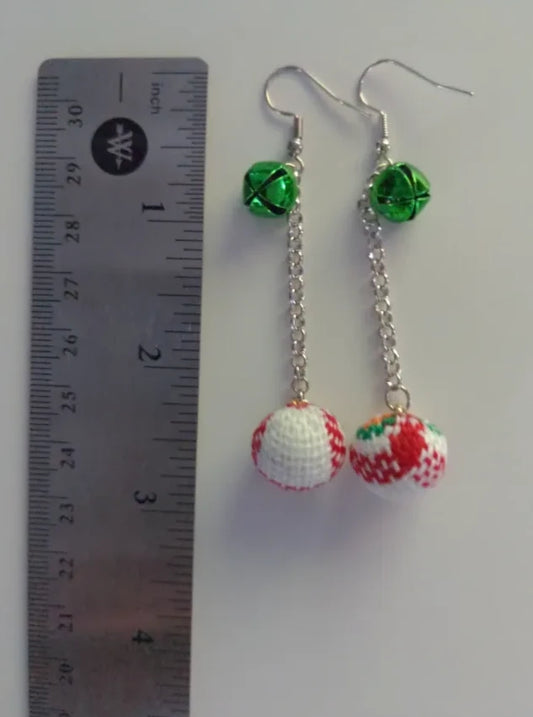 Earrings - Christmas white with red velvet ball ornament with one green jingle bell on silver chain drop hook