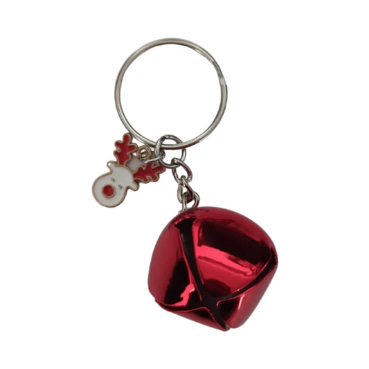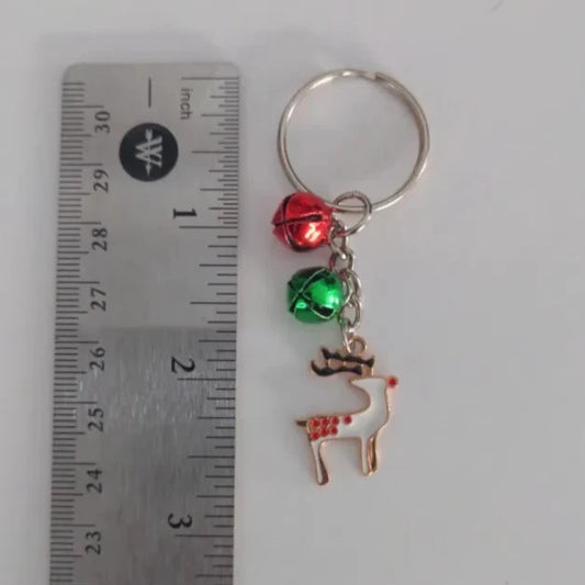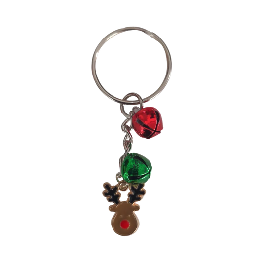 Keychain - White Rudolph reindeer with two Small Jingle Bells (green and red)