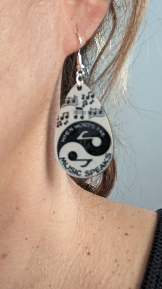 Earrings - Double sided sublimated "when words fail, music speaks" image on silver hook