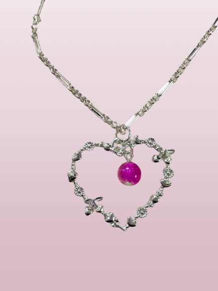 Necklace - 16.5 inches silver figaro chain with silver heart charm and glass bead