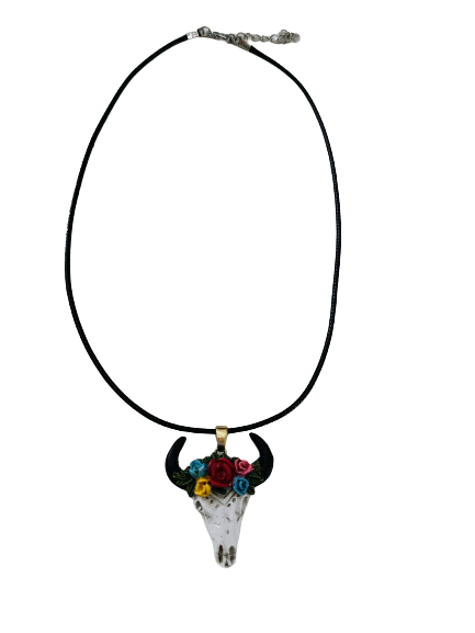 Necklace - 18 inches black leather cord with clasp with white bull with colorful flowers charm