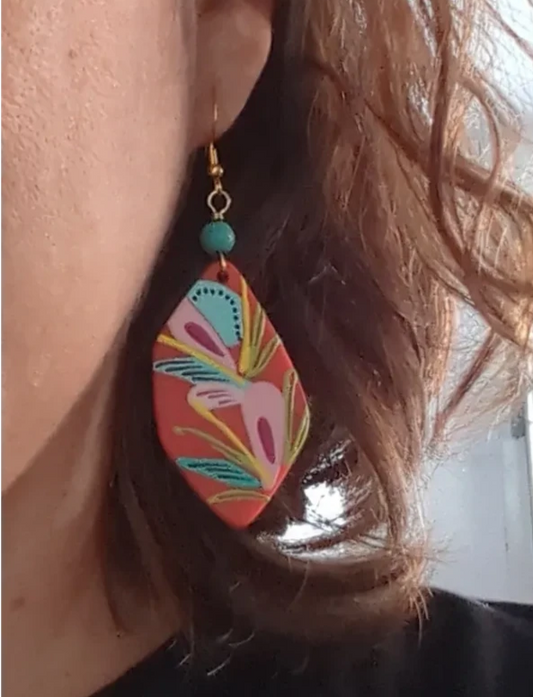 Earrings - Acrylic Orange shape with abstract art and blue bead on hook